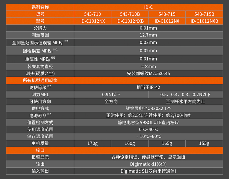 • 543-700B的塵/水防護(hù)等級(jí)達(dá)到IP53 (只限分辨力0.001mm型),使用紐扣式電池(SR44)。